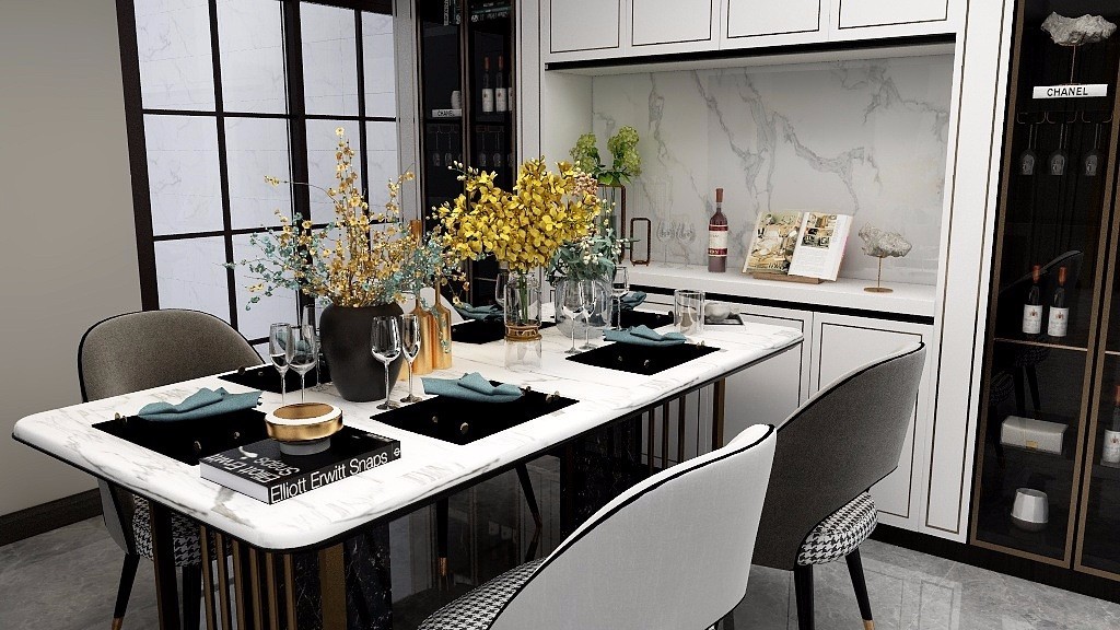 此客廳與餐廳連在一起,采用長(zhǎng)方型4人餐桌