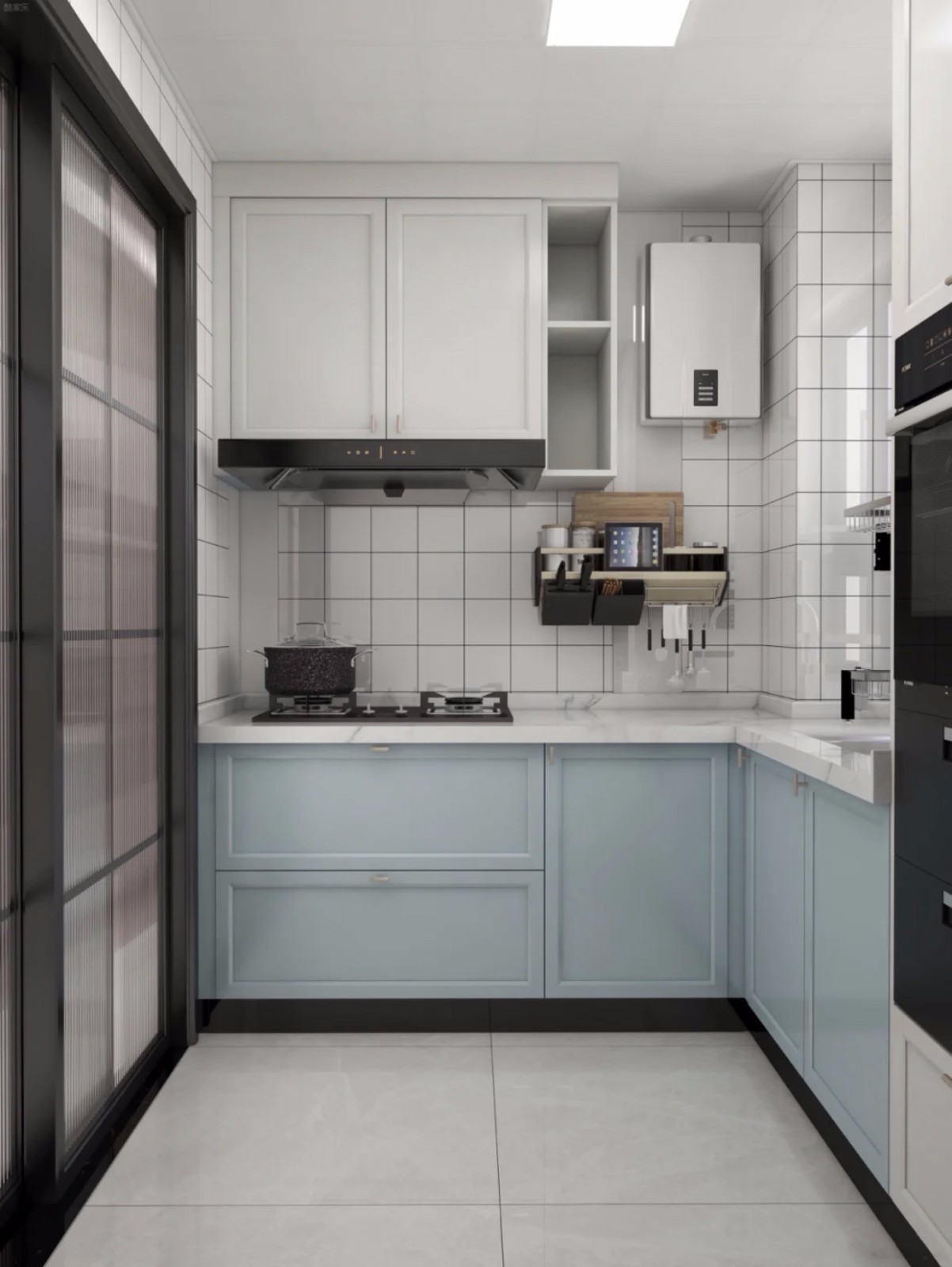 廚房墻面采用近兩年非常流行的小方格白磚,即時(shí)尚又可增加廚房采光度