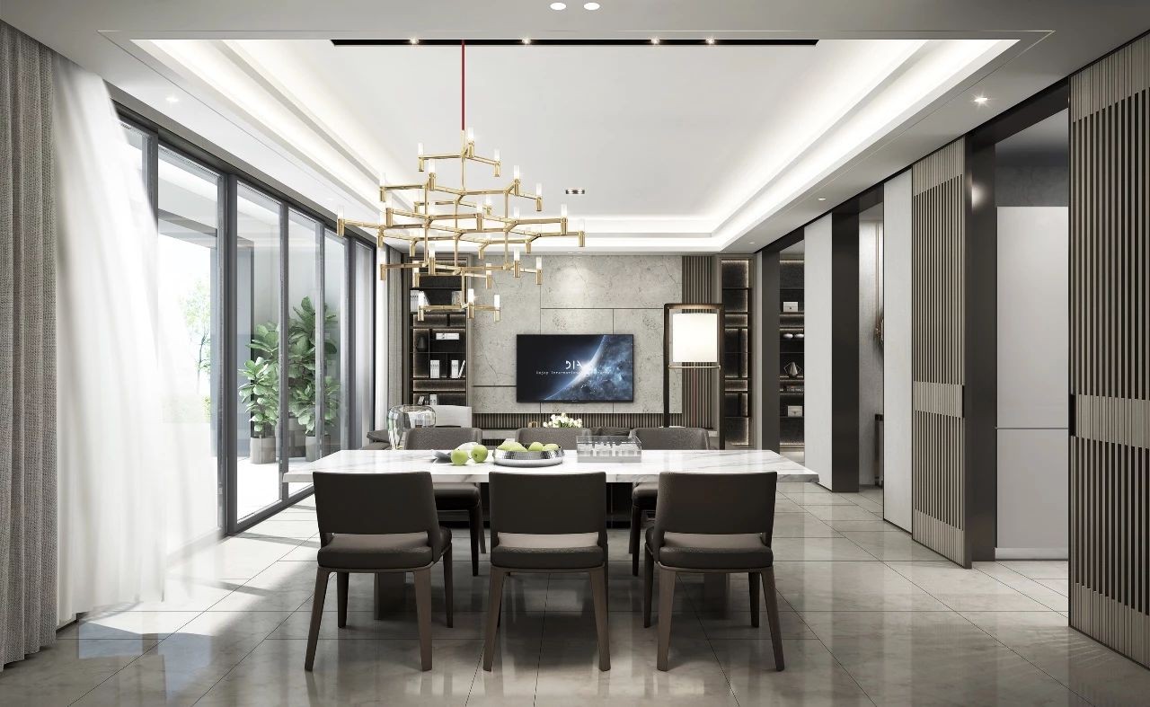 餐廳延續(xù)會(huì)客廳空間的基調(diào),整面落地窗可觀賞室外風(fēng)景,體現(xiàn)自然的安逸氛圍。餐桌上方的吊燈,成了整個(gè)空間的焦點(diǎn),空間中的元素之間體現(xiàn)了方與圓的融合;