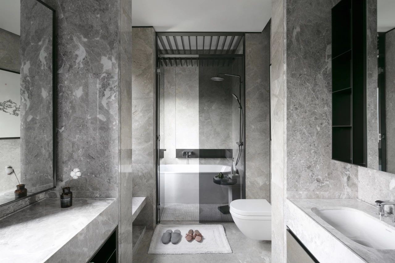 干濕分離的衛(wèi)生間, 黑色自然石墻磚,整個(gè)空間體現(xiàn)出了溫暖的舒適氛圍、自然的材料肌理和豐富的視覺感受