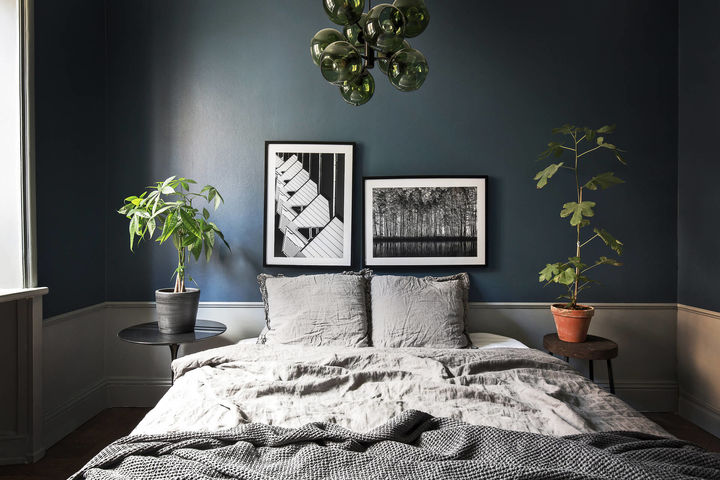 要是家里采光好,果斷用深色,刷一面墻沒意思,要刷就刷整間屋。那種普通帶點(diǎn)顏色的墻漆就算了,我指的是真正的深色。深灰、墨綠、暗紅、藏藍(lán)、暗紫……喜歡什么顏色,就暗幾個(gè)色度的用。只要把大的基調(diào)壓下來,立馬就顯貴。墻面不想用那么深的色彩,深色地面搭配彩色的墻面也是個(gè)好選擇。